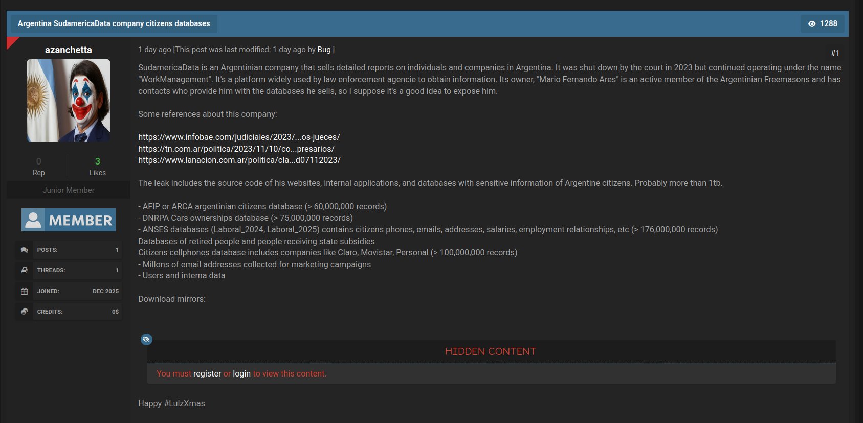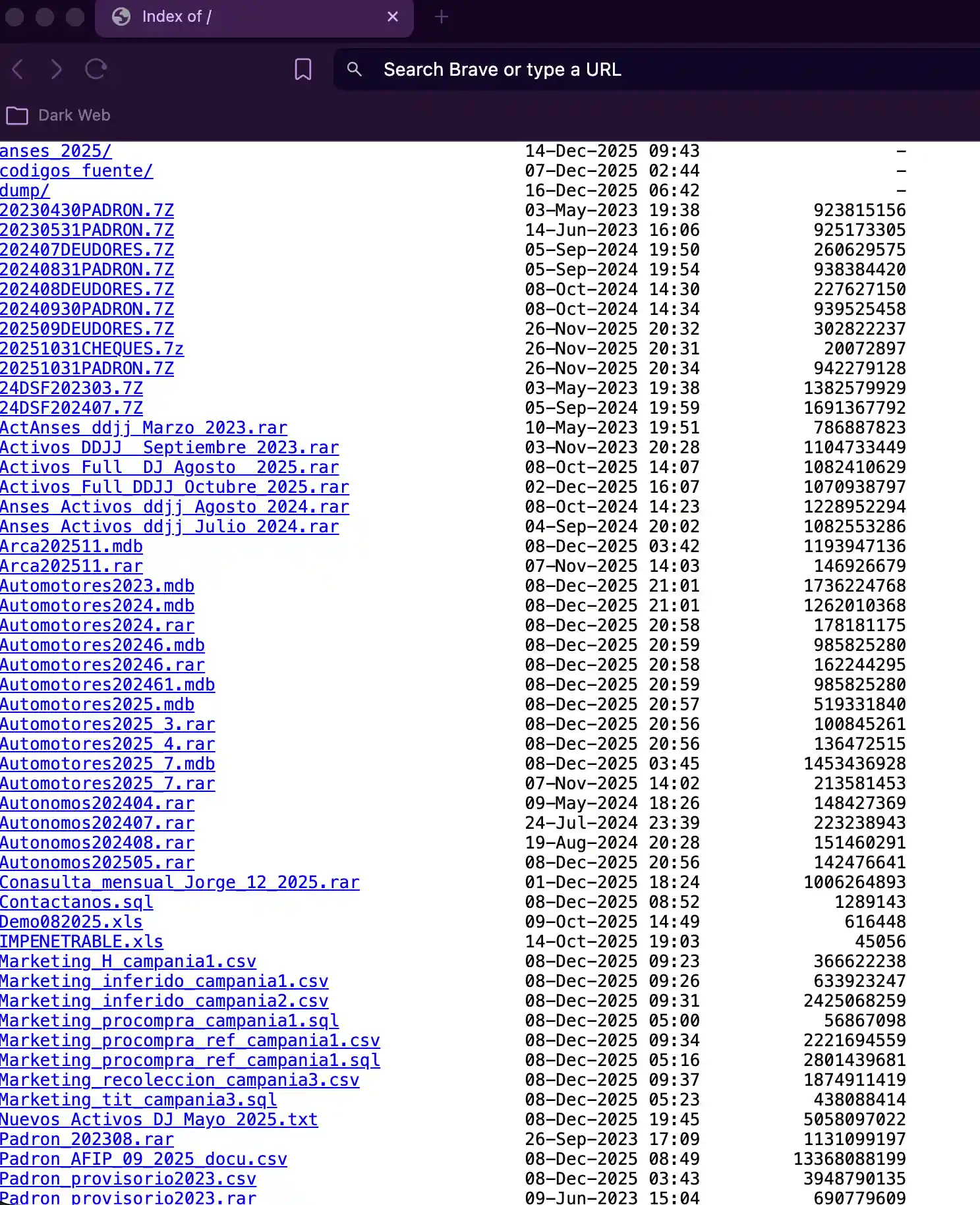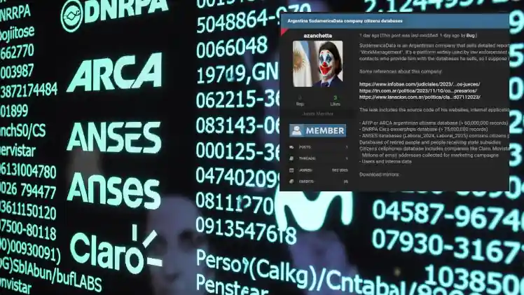 Una masiva filtración de datos personales de millones de argentinos ha sido expuesta en la dark web, según denunció el portal especializado Daily Dark Web. El incidente involucra más de un terabyte de información confidencial proveniente de SudamericaData (que operaba bajo el nombre de WorkManagement tras un cierre judicial en 2023), una empresa dedicada a la venta de informes detallados sobre individuos y compañías. Esta brecha, considerada una de las más graves en la historia del país, incluye bases de datos públicas y privadas, así como código fuente de sistemas internos.