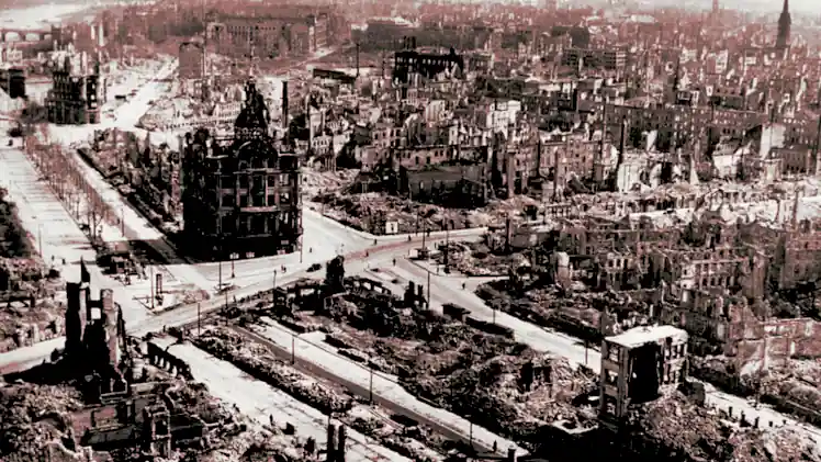 En ese contexto, el 13 de Febrero de 1945 [5] por la noche, la RAF británica realizó dos ataques a Dresden. En la primera oleada, empezaron marcando el centro de la ciudad con bombas luminosas indicadoras. Este solo hecho demuestra que el blanco a destruir no fueron las escasas industrias de la periferia sino los sectores urbanos densamente poblados. En otras palabras: como ya había sucedido en un sinnúmero de otras ciudades alemanas, el objetivo a destruir no fueron blancos de interés militar sino que se eligieron deliberadamente centros urbanos residenciales para aniquilar la mayor cantidad posible de civiles a fin de quebrar psicológicamente la resistencia alemana; un objetivo que, por otra parte, jamás fue logrado.