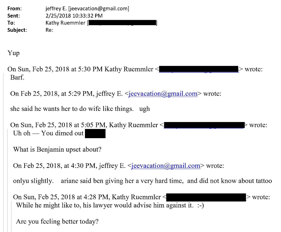 Las revelaciones de la Cámara muestran que Epstein y De Rothschild mantuvieron una estrecha relación en los años previos a la muerte de Epstein. En un intercambio de correos electrónicos en 2018 con Kathryn Ruemmler, ex asesora de la Casa Blanca de Obama, Epstein cotilleó sobre los problemas matrimoniales de De Rothschild con Benjamin De Rothschild, heredero de la fortuna Rothschild. Le escribió a Ruemmler: «Ariane dijo que Ben la estaba haciendo pasar un mal rato y que no sabía nada de tatuajes… dijo que él quería que hiciera cosas de esposa. ¡Uf!». Ruemmler respondió: «¡Vaya!».