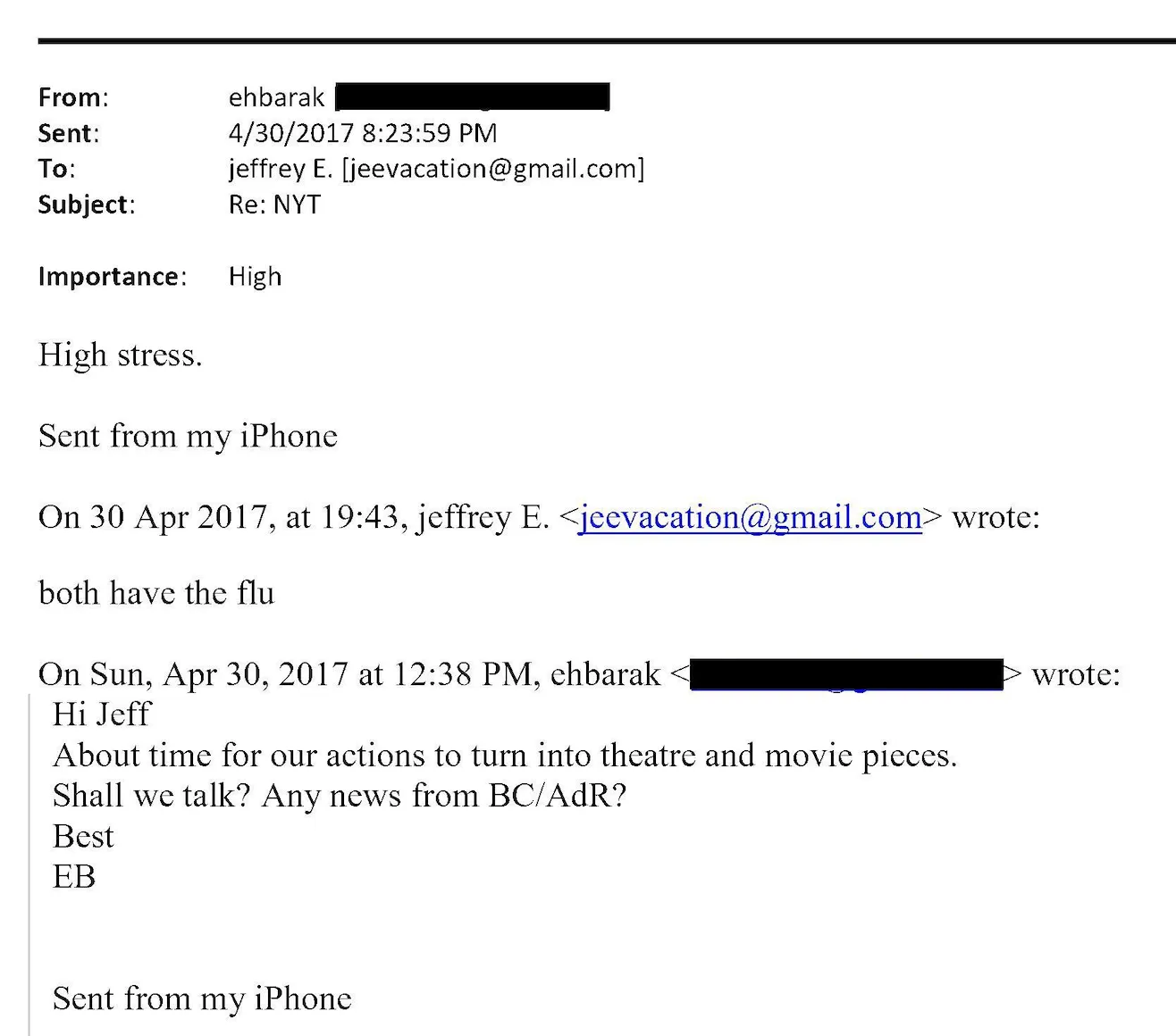 El 30 de abril de 2017, Barak compartió un correo electrónico críptico con Epstein, en un hilo de correos electrónicos donde se discutía una reseña del New York Times sobre la obra de Broadway Oslo , sobre el diplomático noruego Terje Rød-Larsen, un amigo cercano de Epstein que participó en el proceso de paz de la década de 1990 entre Israel y la Organización para la Liberación de Palestina. «Ya era hora de que nuestras acciones se convirtieran en obras de teatro y cine», escribió Barak con picardía. «¿Hablamos? ¿Alguna noticia de BC/AdR?» Epstein respondió: «Ambos tienen gripe». Barak respondió: «Mucho estrés».