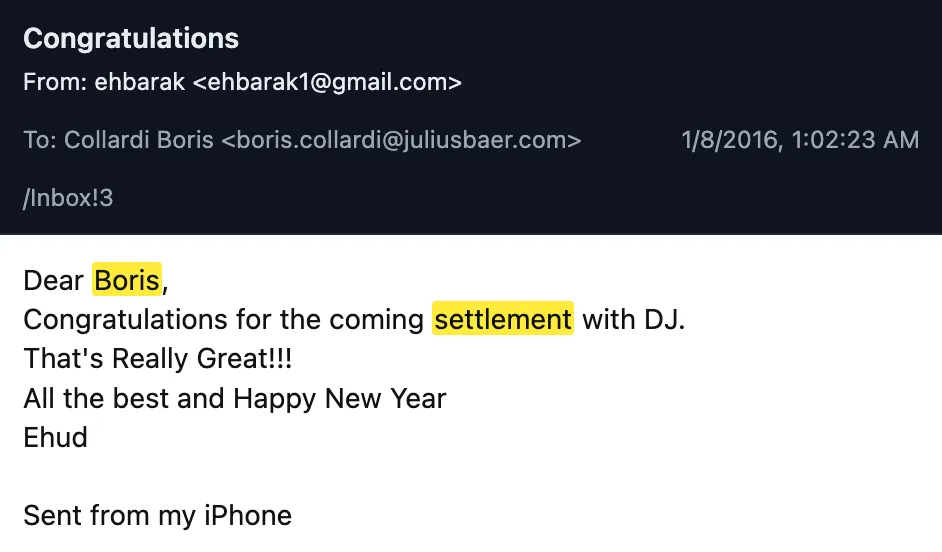 Un mes después, el 1 de enero de 2016, Barak envió un correo electrónico de felicitación a Collardi por el acuerdo alcanzado con Julius Baer en un caso separado de evasión fiscal del Departamento de Justicia, en el que el banco fue acusado de ayudar a clientes estadounidenses a ocultar 600 millones de dólares en cuentas suizas no declaradas; el banco devolvió casi la totalidad del importe al gobierno estadounidense. Barak escribió a Collardi una nota entusiasta: «¡¡¡Eso es realmente genial!!!». Epstein envió a Barak una copia de la demanda de decomiso civil del Departamento de Justicia , que exigía a Julius Baer la entrega de 220 millones de dólares. Collardi no respondió a la solicitud de comentarios de Drop Site.