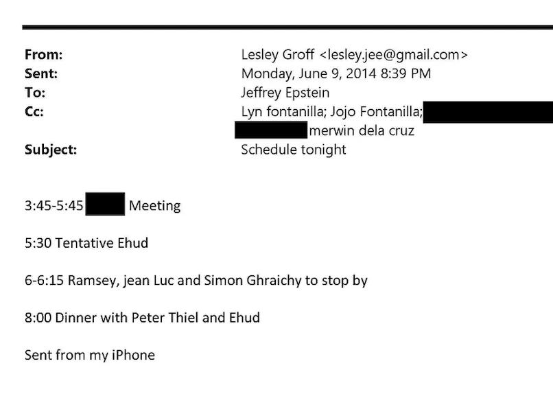 Barak tenía previsto hablar en Herzliya el 10 de junio de 2014 y tenía previsto reunirse con De Rothschild en la conferencia. Pocos días antes del inicio de la conferencia, Epstein le informó de sus planes de última hora para una cena con Peter Thiel el 9 de junio en su mansión de Manhattan. Barak permaneció en Nueva York y canceló su reunión con De Rothschild en Israel.