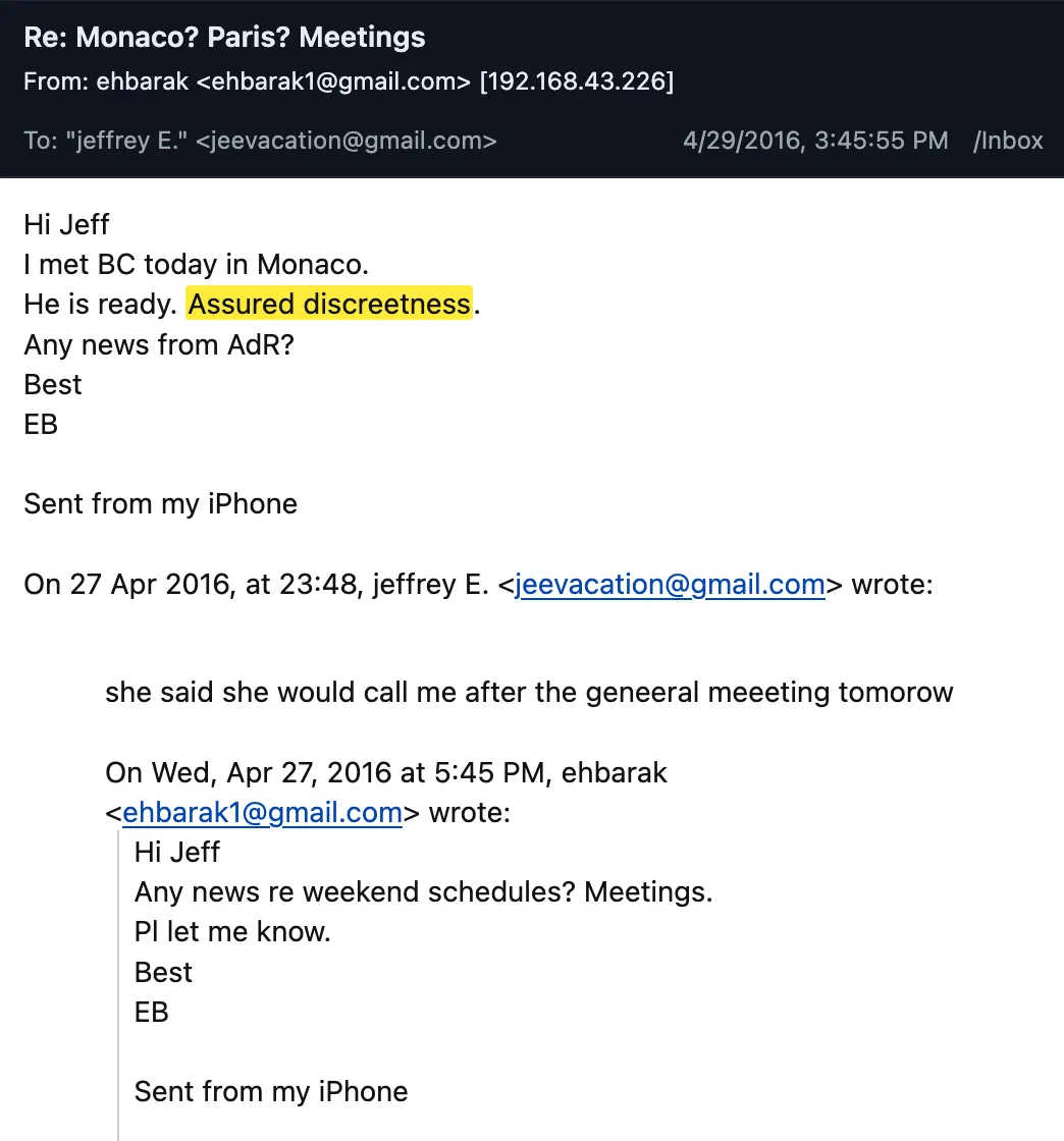 En abril de 2016, el mismo mes de la filtración de los Papeles de Panamá, las conversaciones entre Epstein y Barak en el buzón del ex primer ministro israelí se detuvieron. Una de las últimas conversaciones entre ambos hombres se centró en una reunión discreta entre De Rothschild y Collardi. El 27 de abril, Barak envió un correo electrónico a Epstein sobre sus agendas de fin de semana. Epstein respondió: «Dijo que me llamaría después de la junta general».Dos días después, el 29 de abril, Barak le escribió a Epstein: «Me reuní con BC [Boris Collardi] hoy en Mónaco. Está listo. Le aseguro discreción. ¿Alguna noticia de AdR [Ariane de Rothschild]?»