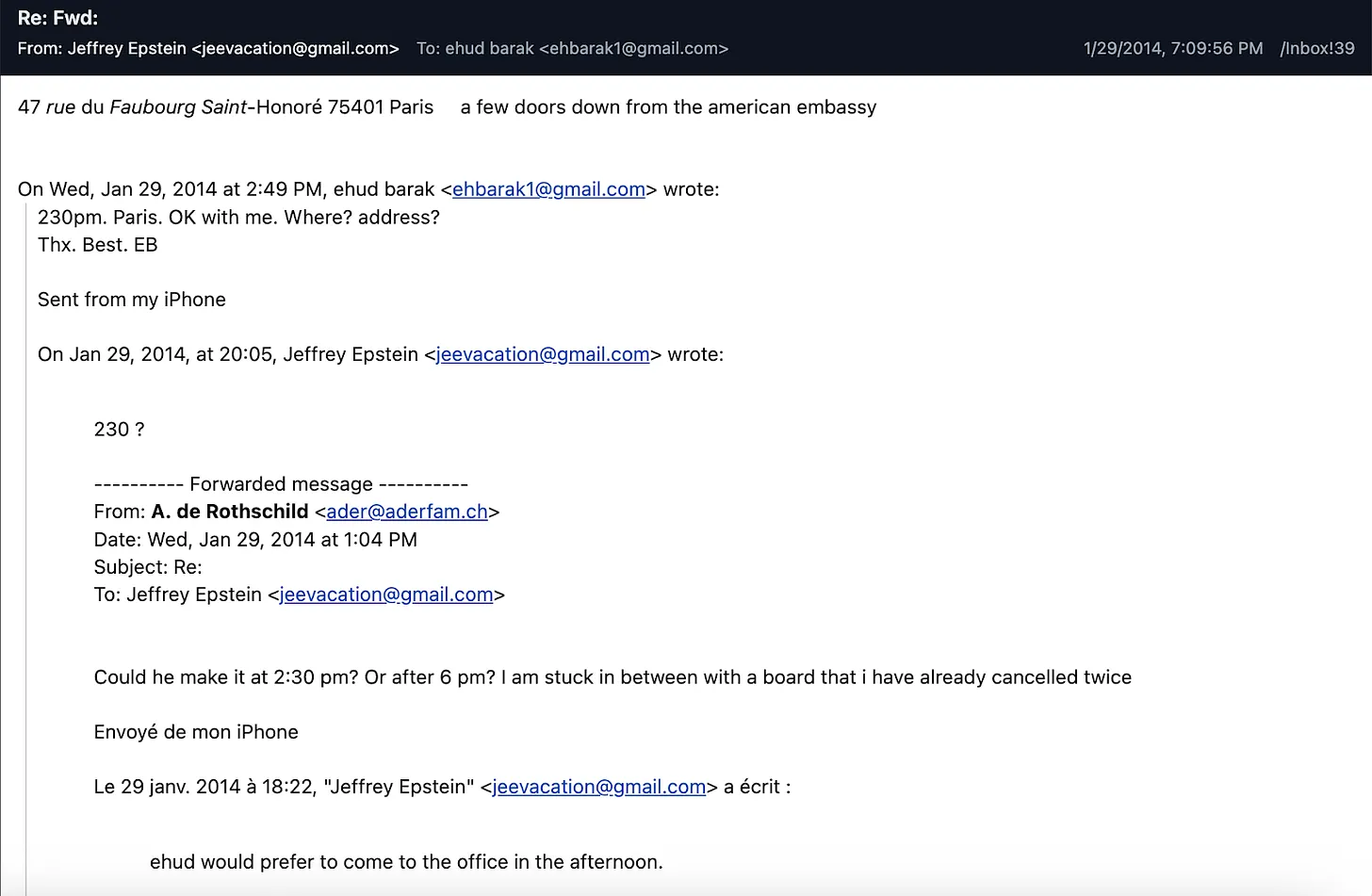 Mientras tanto, Epstein continuó fomentando la creciente relación personal entre Barak y Ariane de Rothschild. El 30 de enero de 2014, Epstein invitó a Barak a una cena en París con él, Ariane de Rothschild y el presidente francés, Nicolas Sarkozy. El propio Epstein se retiró de la reunión poco antes, alegando estar resfriado. Sin embargo, como muestra de su gran interés en la reunión, gestionó toda la logística por correo electrónico, y finalmente organizó la visita de Barak a la oficina del banco Rothschild en París.