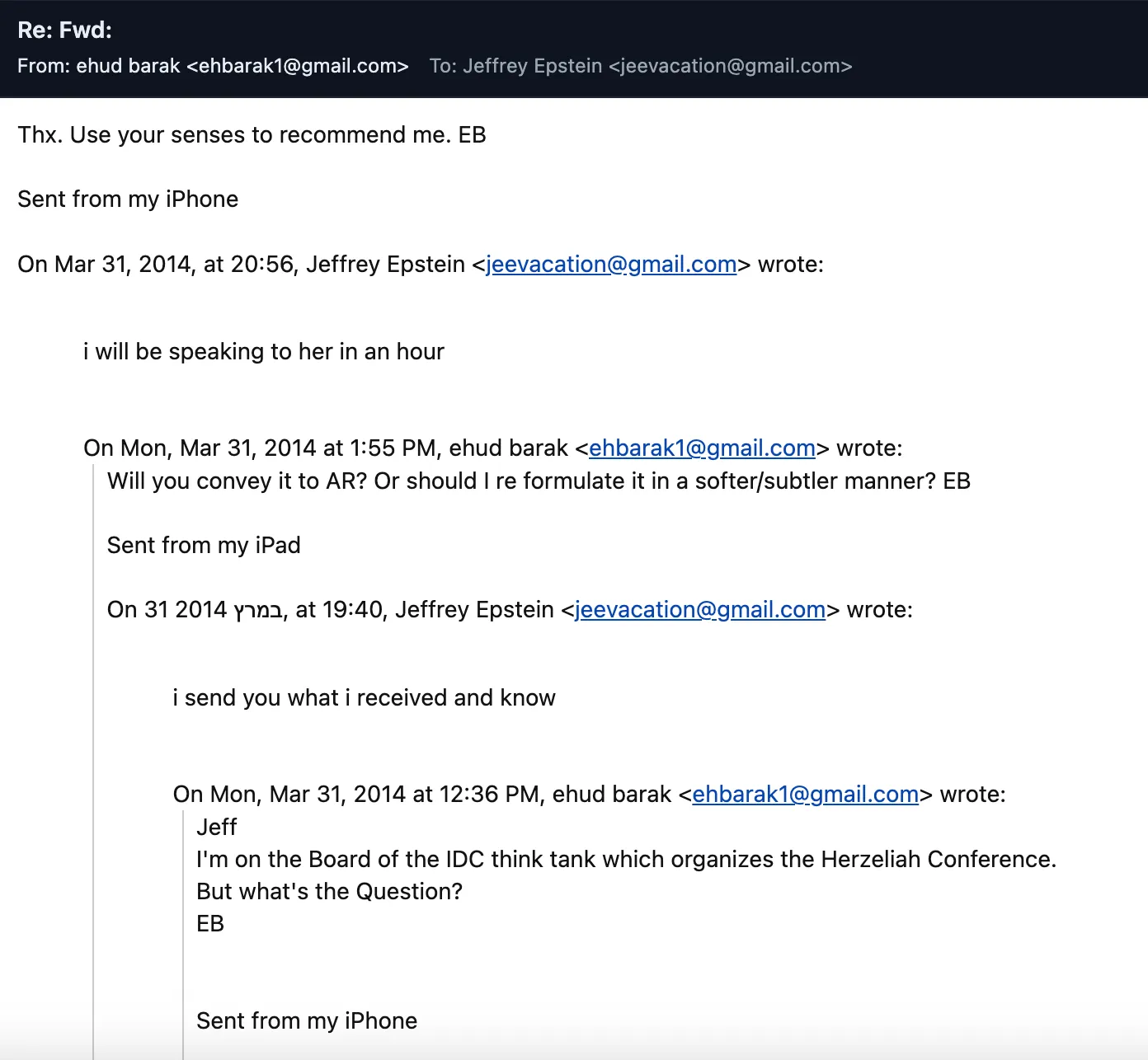 Barak quería ser útil, pero no estaba seguro de cómo responder al mensaje de De Rothschild sobre los asistentes a la conferencia: «Soy miembro de la junta directiva del grupo de expertos IDC que organiza la Conferencia Herzeliah (sic). Pero ¿cuál es la pregunta?» Epstein respondió: «Le envío lo que recibí y sé» y le dijo a Barak: «Hablaré con ella en una hora». Barak le pidió a Epstein que recopilara más contexto: «Gracias. Use su sentido común para recomendarme». Al día siguiente, Barak compartió la lista de oradores de la conferencia con Epstein para que se la entregara a De Rothschild, con una nota: «Por favor, no comparta este material con otros».
