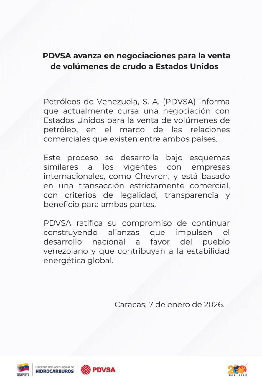 “Este proceso se desarrolla bajo esquemas similares a los vigentes con empresas internacionales, como Chevron, y está basado en una transacción estrictamente comercial, con criterios de legalidad, transparencia y beneficio para ambas partes», señaló la empresa en un comunicado difundido en sus redes sociales.