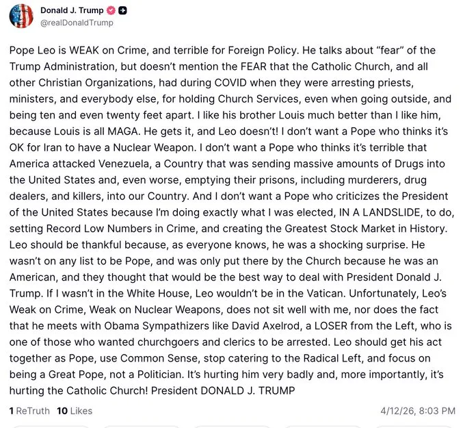 «No quiero un papa que piense que es terrible que EE.UU. atacara a Venezuela, un país que enviaba cantidades masivas de drogas a EE.UU. y, lo que es peor, vaciaba sus prisiones, incluyendo a asesinos, traficantes de drogas y homicidas, para enviarlos a nuestro país», escribió el mandatario en su cuenta de Truth Social.
