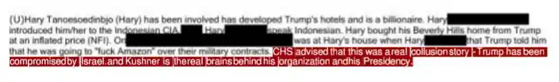 El informe vincula a la familia de Kushner con la corrupción, el dinero ruso y el grupo ultrasionista Jabad Lubavitch. También señala al abogado de Jeffrey Epstein, Alan Dershowitz, como «cooptado por el Mossad [el servicio de inteligencia israelí]» para controlar a estudiantes de élite. El padre de Kushner fue condenado por delitos financieros, pero posteriormente indultado por Trump.
